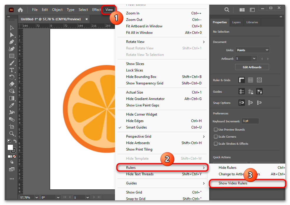 - Разверните меню «View» («Просмотр»), наведите курсор на пункт «Rulers» («Линейки») и кликните по «Show Rulers» («Показать линейки»).
