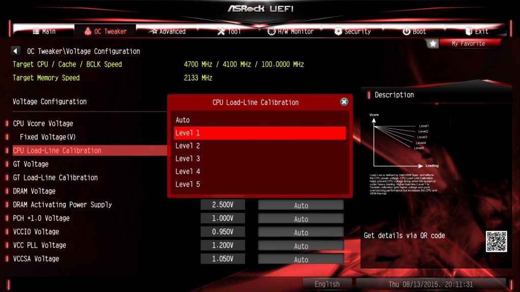 До искомого параметра CPU Load-Line Calibration в настройках BIOS можно добраться, следуя по по пути (для материнских плат ASRock): OC Tweaker → Voltage Configuration → CPU Load-Line Calibration. Выбор этого пункта приводит к загрузке контекстного меню, в котором, в свою очередь, можно выбрать одно из 6-ти значений: Level 1-5 и Auto.