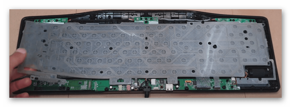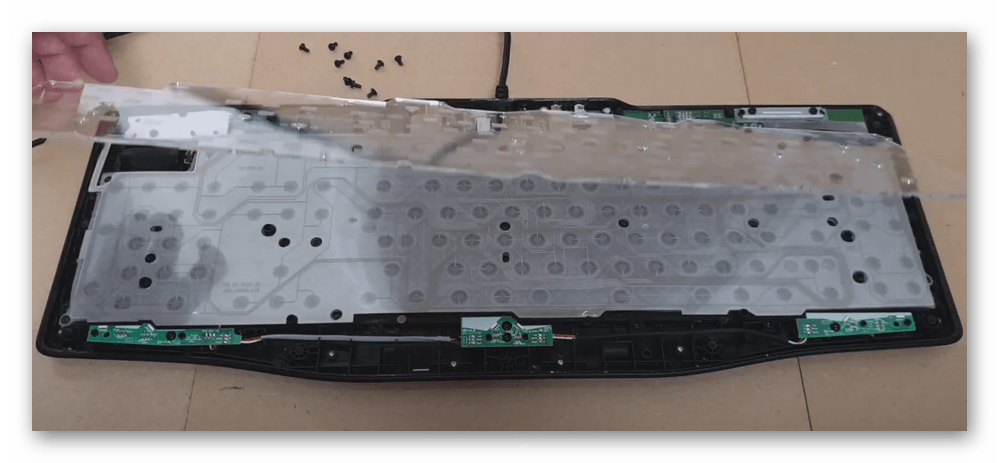 Удостоверившись, что больше крышку ничего не удерживает, аккуратно подцепите ее чем-то тонким и не сильно острым, например, ненужной карточкой. Сняв заднюю крышку у клавиатуры, вы увидите пленку с проводниками, возможно, защищенную специальным слоем (или двумя). Она вместе с защитой прикручена винтиками по периметру.