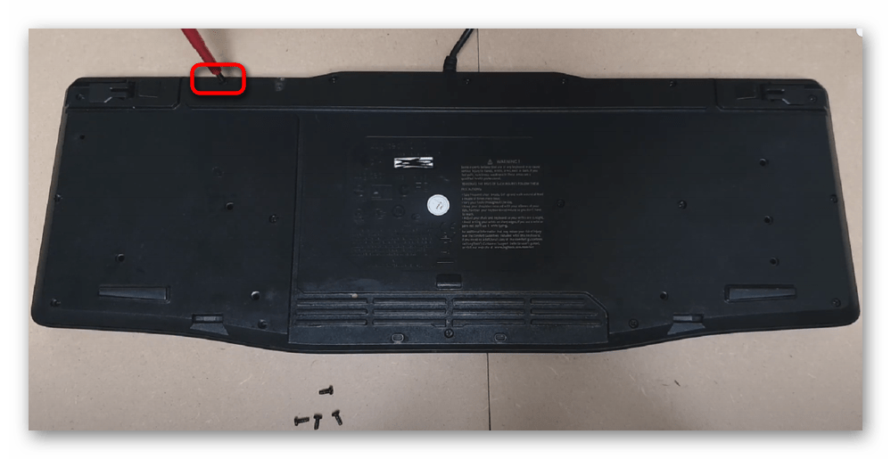 - Начинается разбор с задней стороны, где и находятся все винтики. Воспользуйтесь подходящей отверткой и снимите 6 винтов: по одному с каждого края и два из центра. У некоторых клавиатур, особенно у старых, их расположение и количество другое, у более дорогих и современных моделей они бывают скрыты резиновыми ножками, предотвращающими скольжение девайса по поверхности. Аккуратно подденьте каждую ножку и снимите ее. Не выбрасывайте их — в дальнейшем ножки можно снова наклеить на те же места.