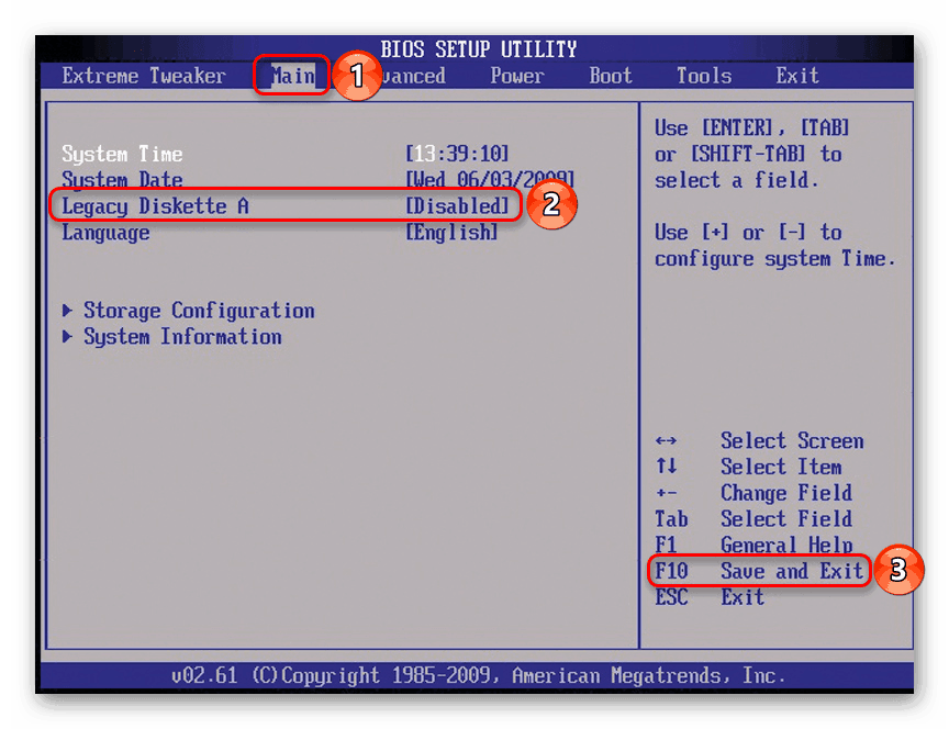 - В AMI BIOS на вкладке «Main» найдите настройку «Legacy Diskette A», нажмите на нее и выберите значение «Disabled».