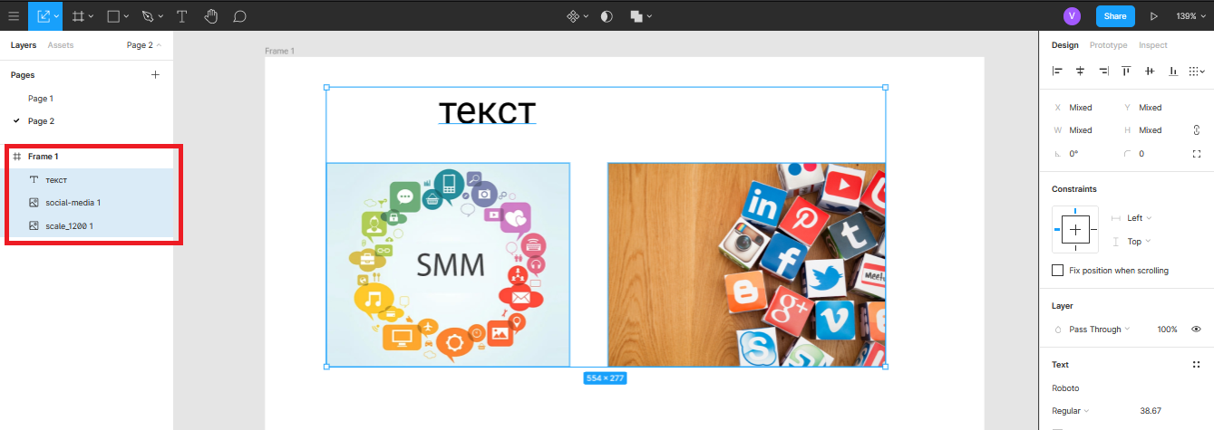 В Figma есть несколько способов выделения объектов. Первый из них – это ручное выделение мышкой тех элементов, которые вам необходимы. Но иногда при помощи этого метода невозможно сделать выборочное выделение. Поэтому в левой части интерфейса в созданном фрейме будет список всех объектов, которые в нем содержатся. Как видно в примере на иллюстрации – это две картинки и текст. Таким образом, используя клавишу «Ctrl» можно выбрать объекты, которые вы хотите выделить.