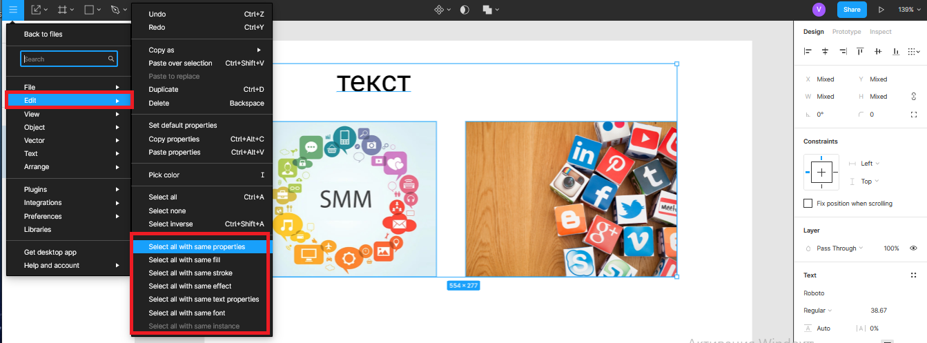 - «Select all with same text properties» — это выделение текстовых объектов с одинаковыми параметрами.
