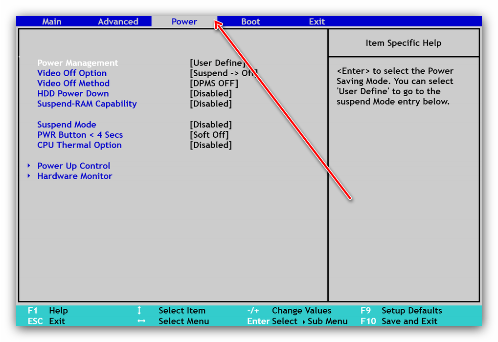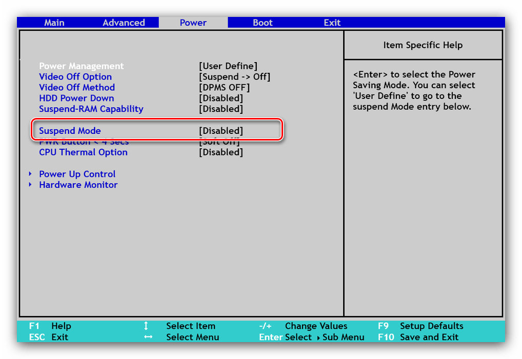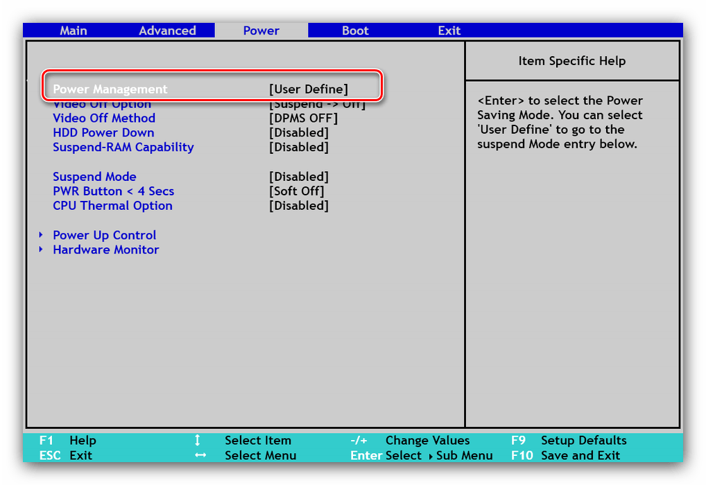 Дальнейшие варианты действий также отличаются для разных БИОС: например, в приведённом на скриншоте варианте нужно первым делом переключить опцию «Power Management» в положение «User Defined». В других интерфейсах это может быть реализовано так же или опции изменения режимов будут доступны сразу.