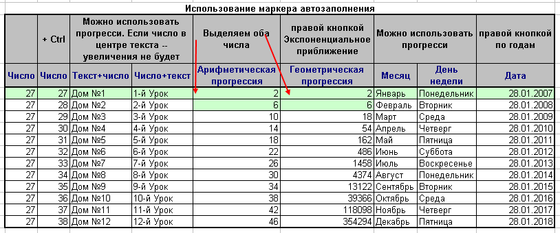 - Создание различных встроенных в Excel последовательностей (названия месяцев, дней недели, даты, время);
