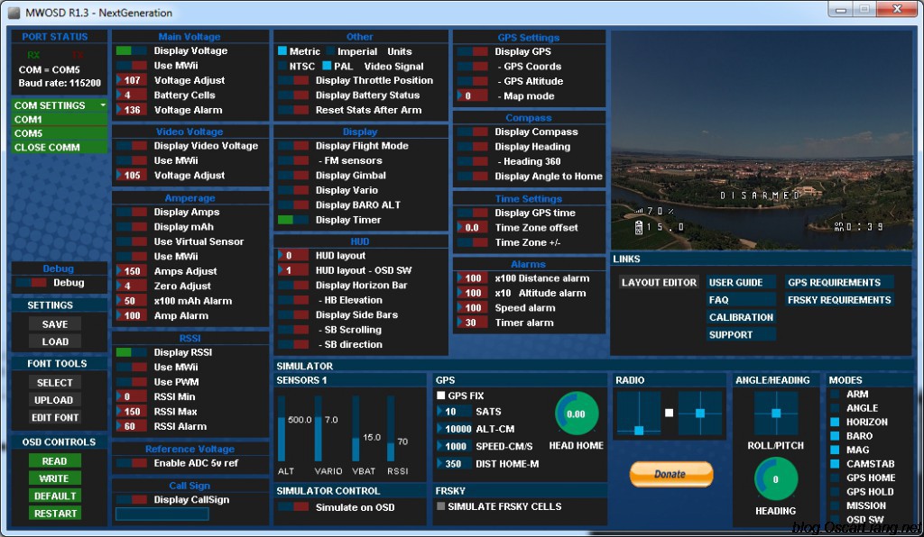 Существует довольно много прошивок для MinimOSD, моя любимая Multiwii-OSD (mwosd). Текущая версия 1.3., ее конфигуратор — очень удобная программа. Экранное меню понятное, прошивка обновляется, имеется поддержка Cleanflight и Baseflight. Еще она позволяет настраивать ПИД коэффициенты прямо через экранное меню.