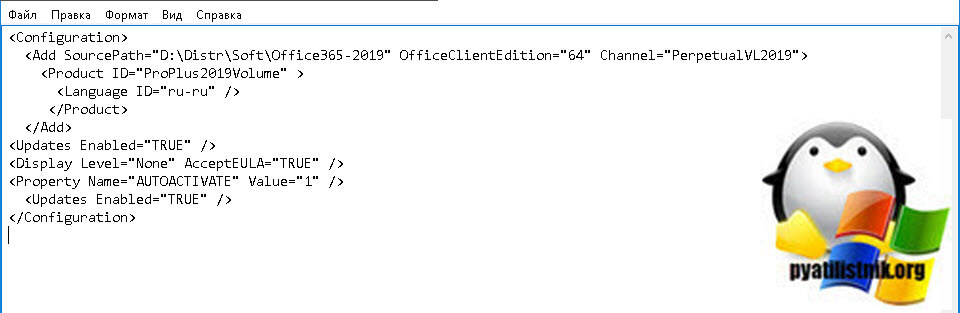 <Add SourcePath=»D:\Distr\Soft\Office365-2019″ OfficeClientEdition=»64″ Channel=»PerpetualVL2019″> <Product ID=»ProPlus2019Volume»> <Language ID=»ru-ru /> </Product> </Add> <Updates Enabled=»TRUE» /> <Display Level=»None» AcceptEULA=»TRUE» /> <Property Name=»AUTOACTIVATE» Value=»1″ />