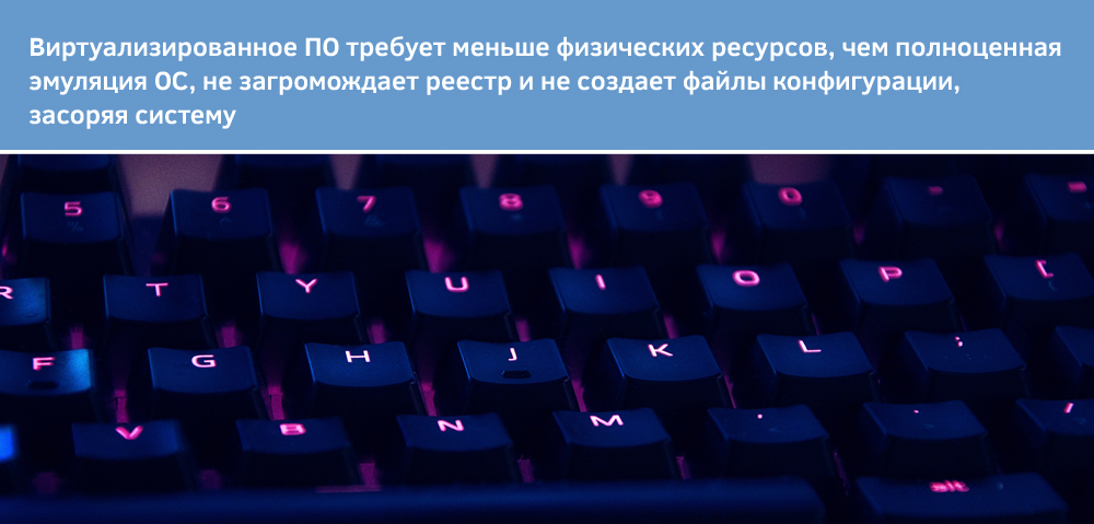 Главный плюс виртуализации приложений заключается в их независимой работе (а значит, конфликты исключены). Виртуализированное ПО требует меньше физических ресурсов, чем полноценная эмуляция ОС, не загромождает реестр и не создает файлы конфигурации, засоряя систему.