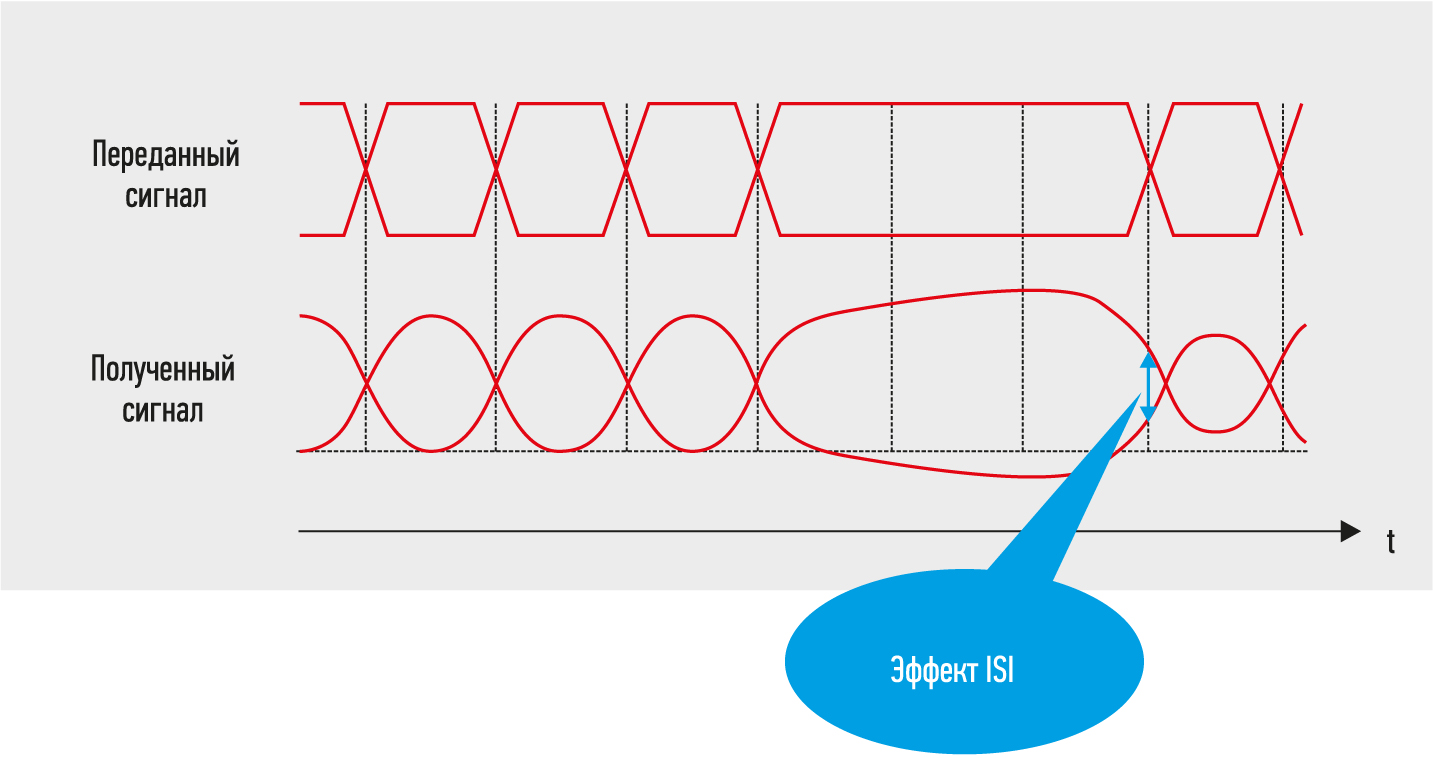 Ухудшение качества сигнала по причине ISI происходит из-за смещения, которое возникает в линии при недостаточной частоте переключений сигнала с 0 на 1 (рис. 5). Из-за этого следующее переключение на противоположное значение после ряда одинаковых бит происходит медленнее.