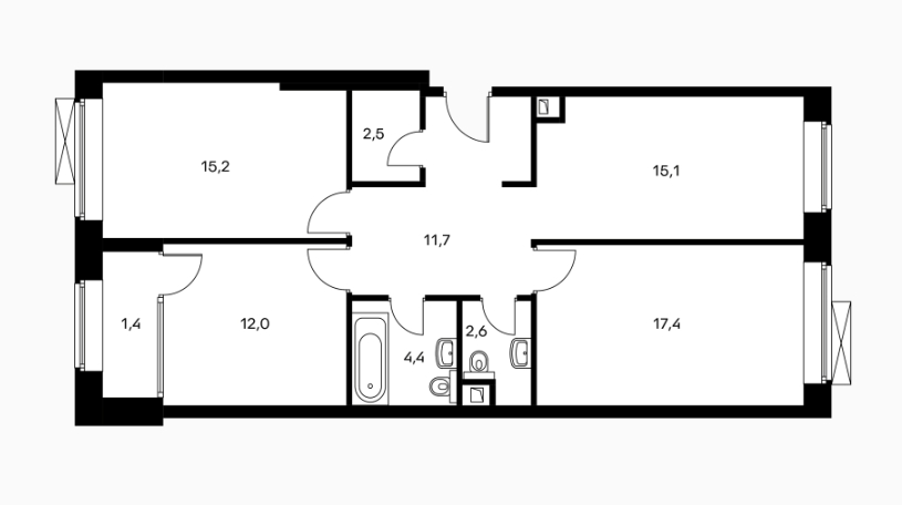 Площадь четырёхкомнатной квартиры 68 м2. Комнаты там меньше, чем в трёшках. Одна из них проходная.