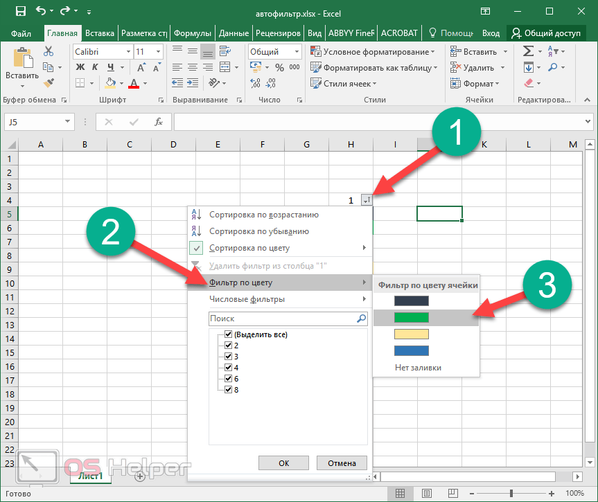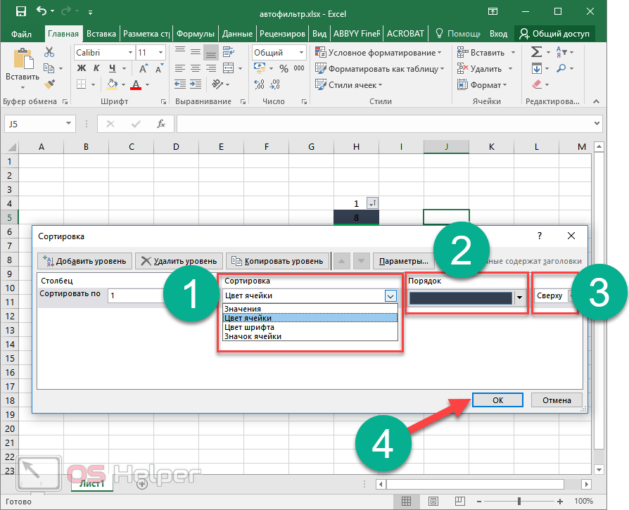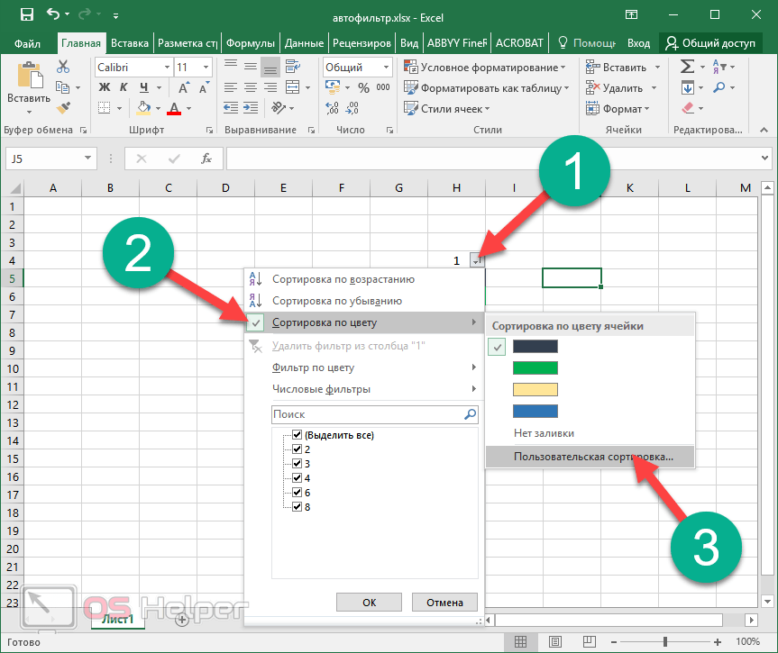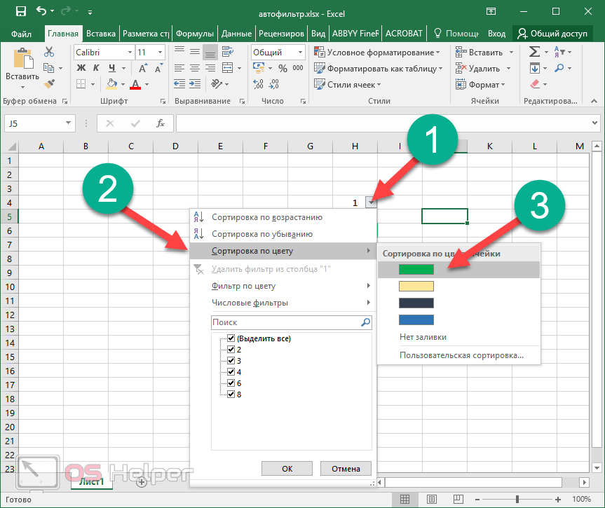 - отбор по цвету: дает возможность отсортировать данные по цвету шрифта или заливки,