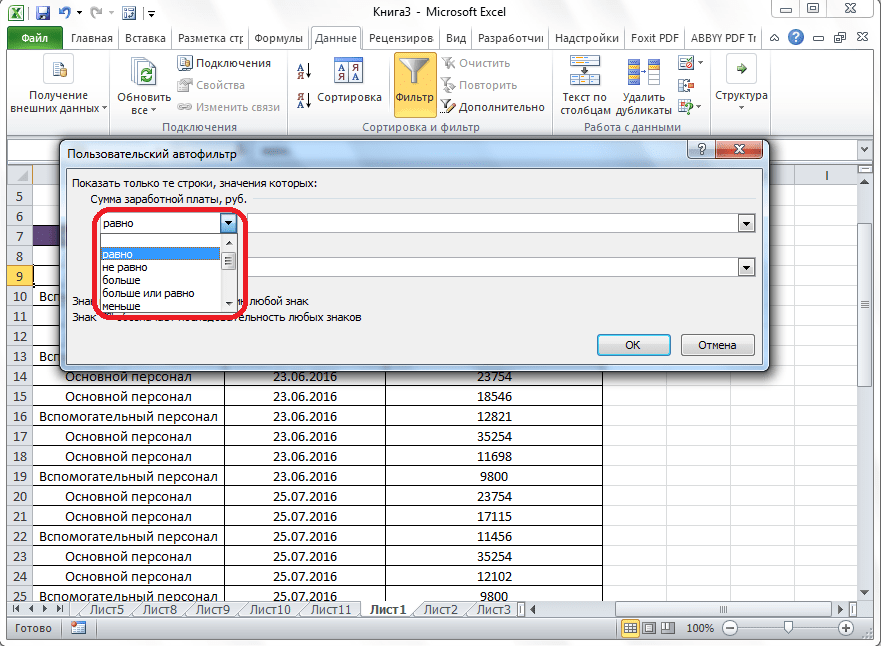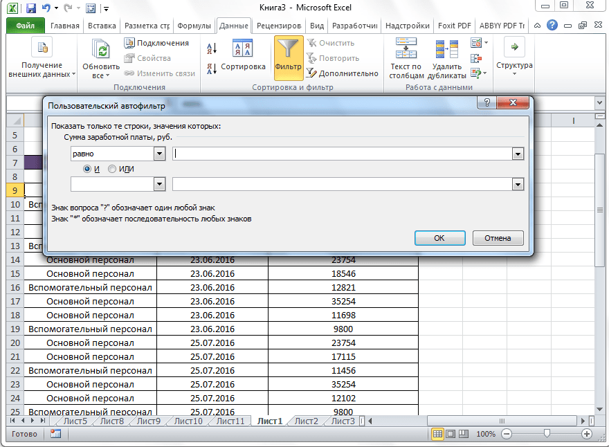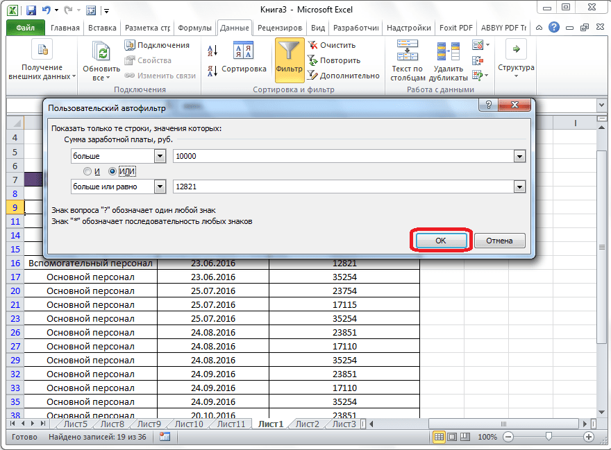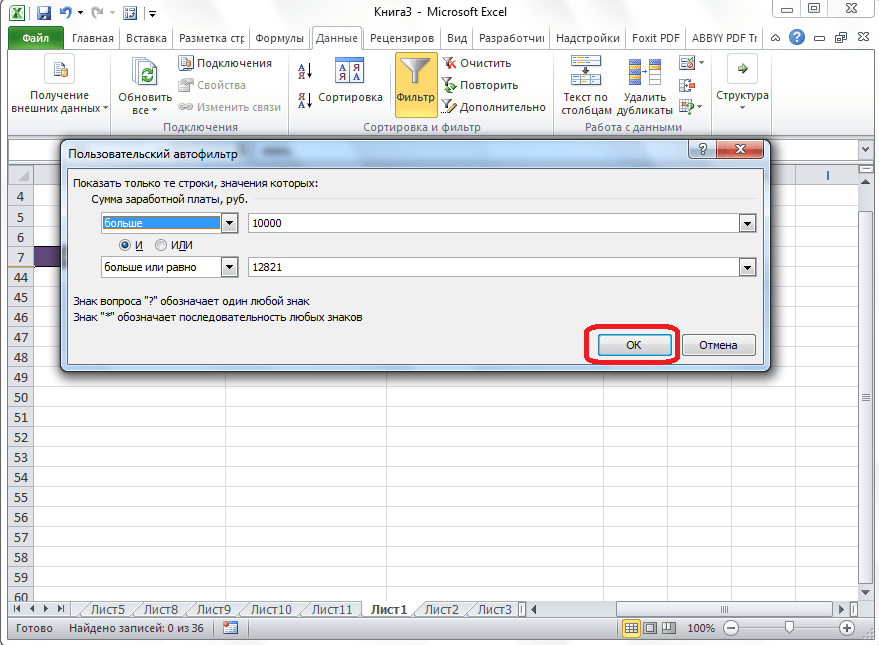 Например, в колонке о заработной плате зададим пользовательский автофильтр по первому значению «больше 10000», а по второму «больше или равно 12821», включив при этом режим «и».