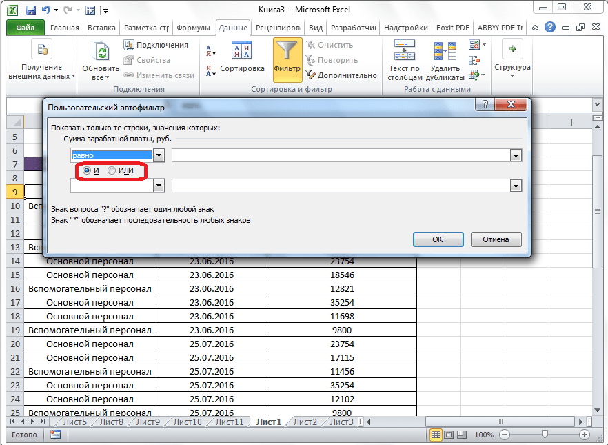 При этом, мы можем на выбор обязательно применять сразу два значения данных в ячейках столбца одновременно, или только один из них. Выбор режима можно установить, воспользовавшись переключателем «и/или».