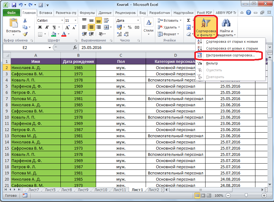 Если возникла необходимость задать порядок по нескольким столбцам, то в этом поможет значок «Сортировка», который уже упоминался. Выделите диапазон, который необходимо упорядочить