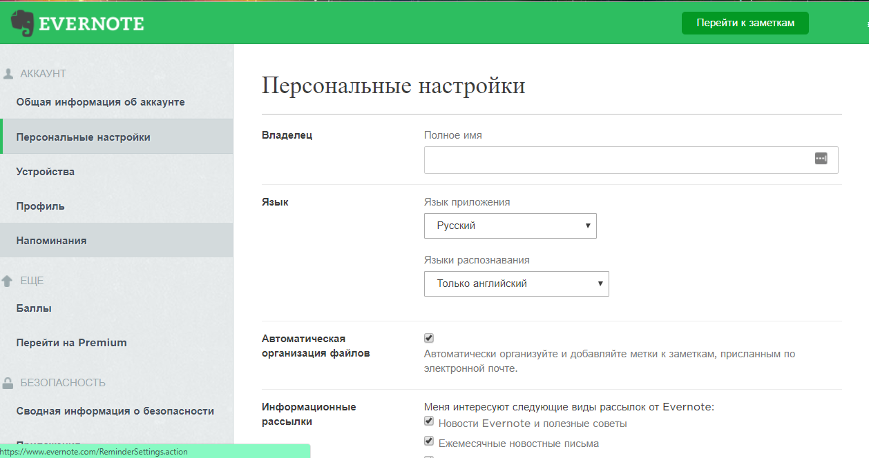 - Персональные настройки — здесь можно изменить имя пользователя, язык сервиса, язык распознавания (для текста, который пользователь «рисует» на экране или фотографирует);