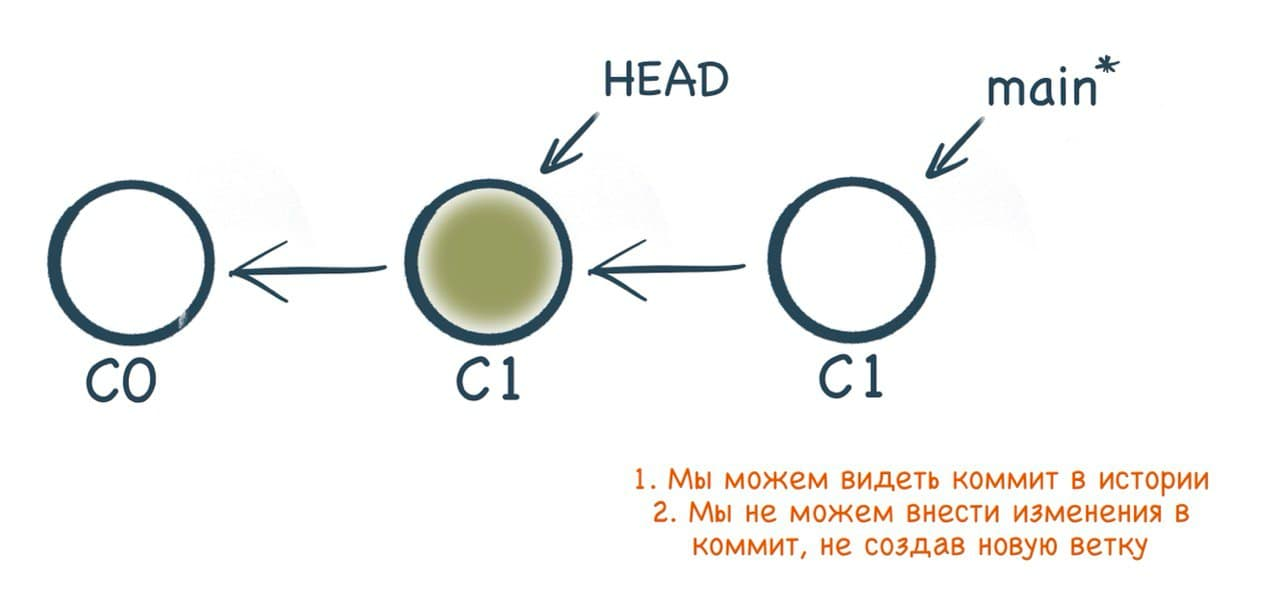 Мы видим, что сейчас указывает на , это тоже указатель, обозначающий ветку. То есть указывает на , который в свою очередь указывает на коммит . Отделение (detaching) означает лишь присвоение его не ветке, а конкретному коммиту.
