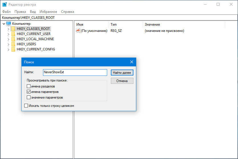 Откройте редактор реестра, выделите мышкой раздел HKEY_CLASSES_ROOT (искать параметр нужно в нём) и нажмите F3, чтобы вызвать окошко поиска. Поскольку другие элементы нам не нужны, отмечаем галочкой только пункт «Имена параметров» и запускаем процедуру поиска.