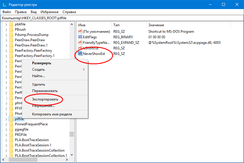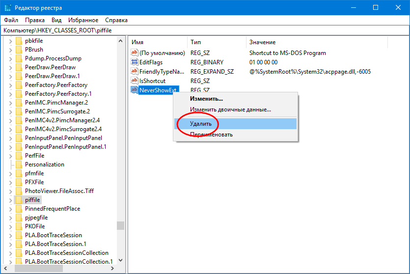 Какой экземпляр за какой тип ярлыка отвечает, догадаетесь по названию. Например, параметр в ключе HKCR/lnkfile отключает показ расширений LNK-ярлыков, а тот же параметр в ключе HKEY_CLASSES_ROOT/piffile — за показ расширения ярлыков типа PIF.