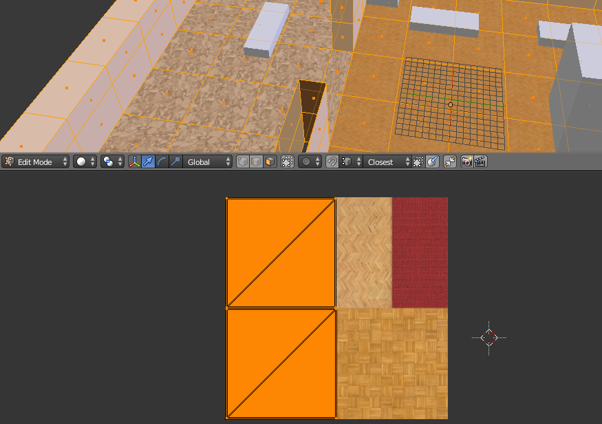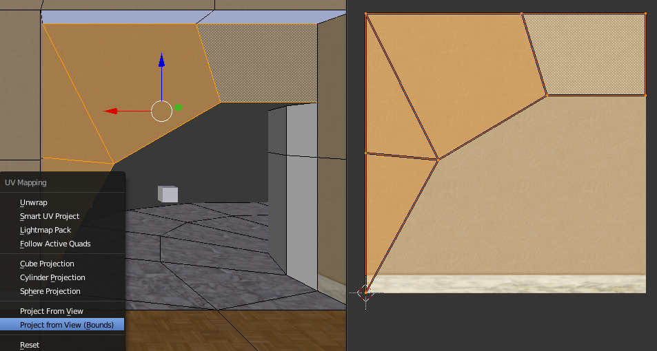 Project from View. Creates the UV unwrap out of what you currently see in your viewport. The main problem with it is that it only works if you don’t move your view around. As this does uncover the stretched textures on the different from the original sides.
