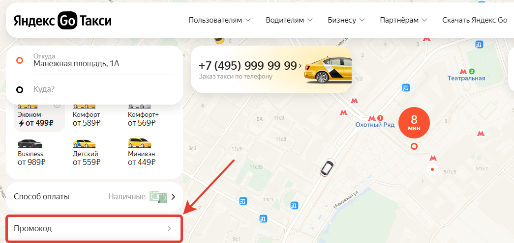 - вызвать такси через приложение или по телефону +7 (495) 999 99 99;