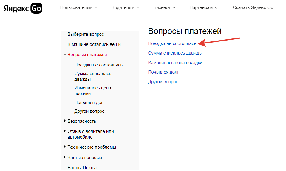 Случаются ситуации, когда деньги за поездку списались, а самой поездки не произошло. Например, водитель не подъехал вовремя, и вы уехали на попутке. В этом случае можно осуществить возврат. Для этого: