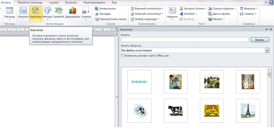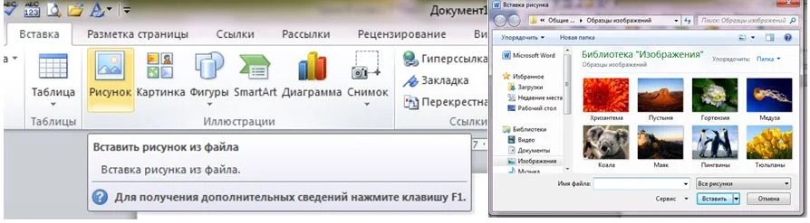 меню «вставка», «рисунок» — позволяют вставлять фотографии, различные рисунки;