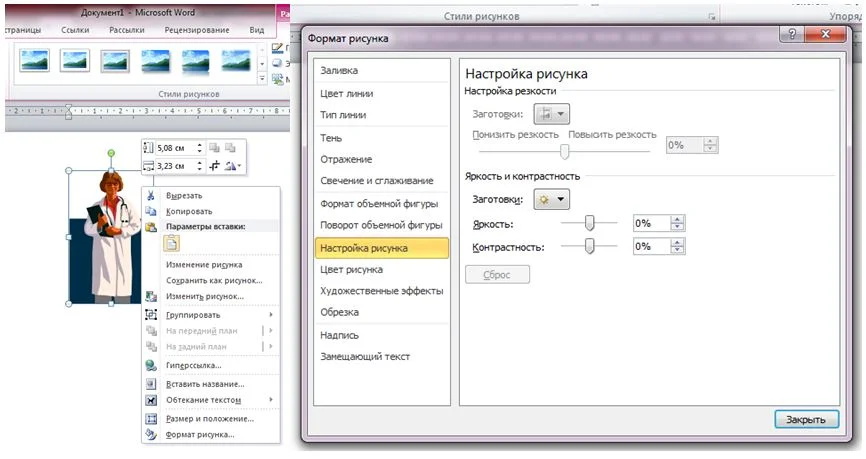 Используя контекстное меню (выделить объект и нажать правую кнопку мыши) можно изменить доступные параметры для данной картинки: