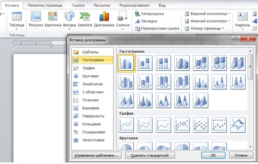 Чтобы вставить диаграмму на лист Ворд, нужно обратиться к меню «Вставка» «Диаграмма»: