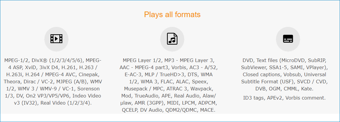- Аудиоформаты: MP3, AAC, FLAC, Vorbis, WMA, ALAC, AMR, DTS, AC-3, LPCM