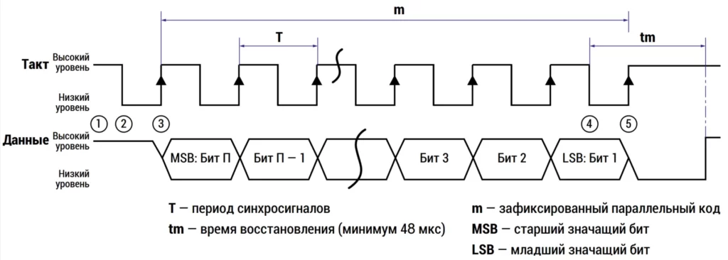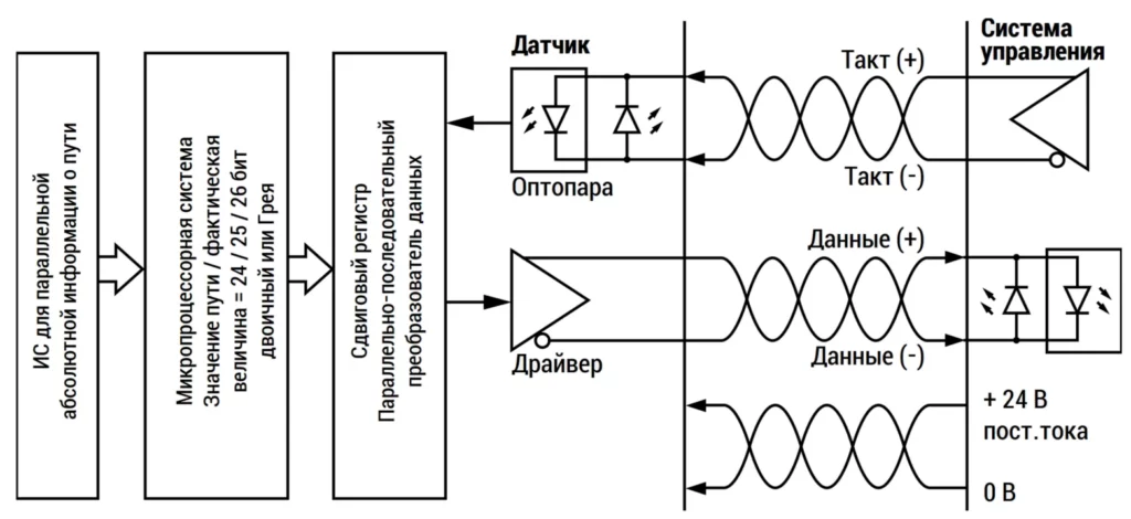 Система управления (контроллер) запрашивает у датчика линейного положения значение текущей координаты, путём посылки импульсной последовательности с периодом «Т» на тактовый вход датчика линейного положения (число тактовых импульсов в последовательности зависит от числа бит, которые необходимо передать).