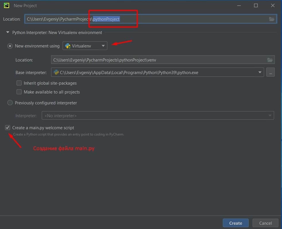 Если вы хотите, что бы с проектом создавался сразу стартовый файл main.py, то не забудьте поставить галочку, как указано на скрине и нажать на кнопку Create.