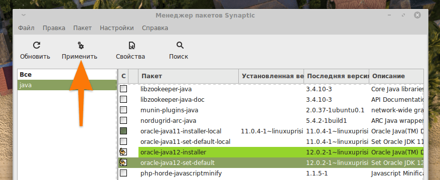 Ставим галочки напротив пакетов oracle-java-installer и oracle-java-set-default.