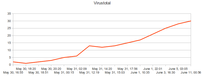 Всего было проведено 15 проверок в период с 30 мая 16:55 по МСК (В дальнейшем, всё время будет указано по МСК) по 11 июня 00:56. На момент публикации данного топика, вирус обнаруживался 30 из 42 антивирусами (71,4%).