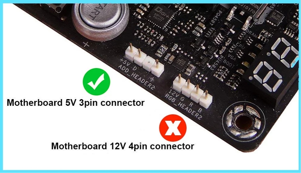 Устройства aRGB совместимы с 3-контактным разъемом 5В, а также не имеют обратной или прямой совместимости с разъемом 12В на многих материнских платах. На самом деле, подключение устройства aRGB со стандартным разъемом 12В на материнской плате может быть довольно опасным. Питание 12В, проходящее через светодиоды, которые предназначены для использования 5В, может почти сразу же повредить светодиоды и сделать любое освещение в вашем устройстве совершенно бесполезным. Это необратимое изменение, и его следует избегать любой ценой.