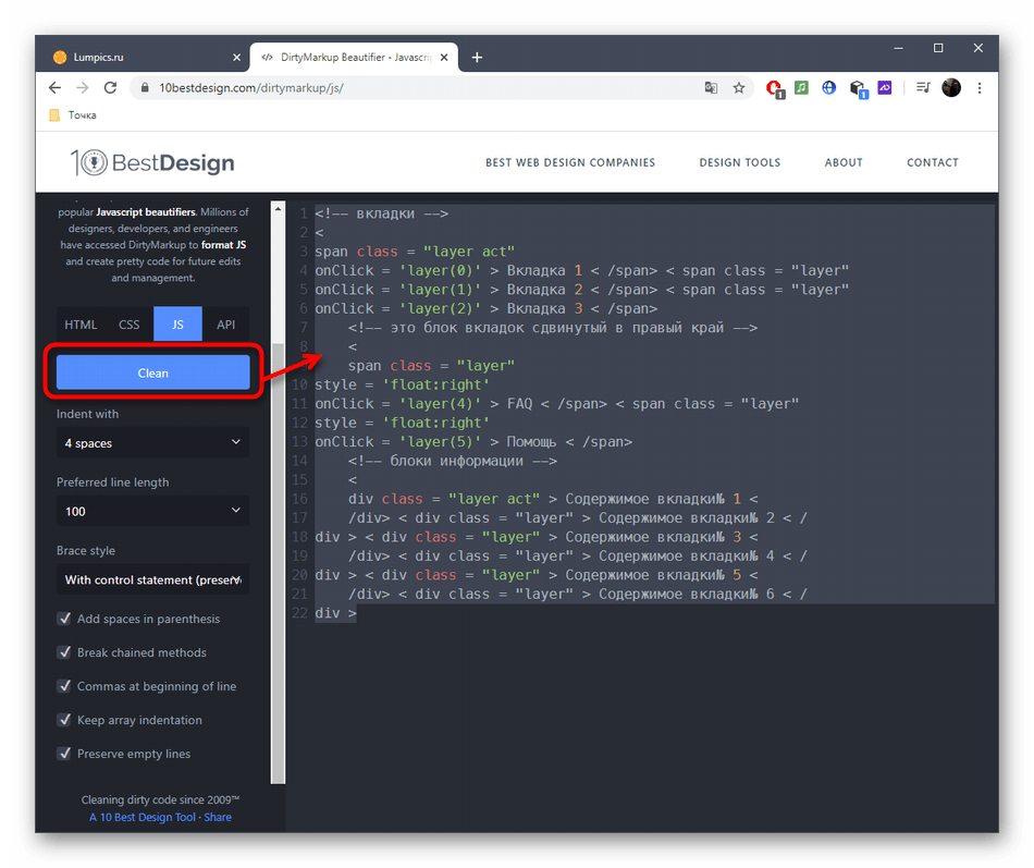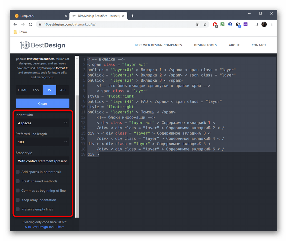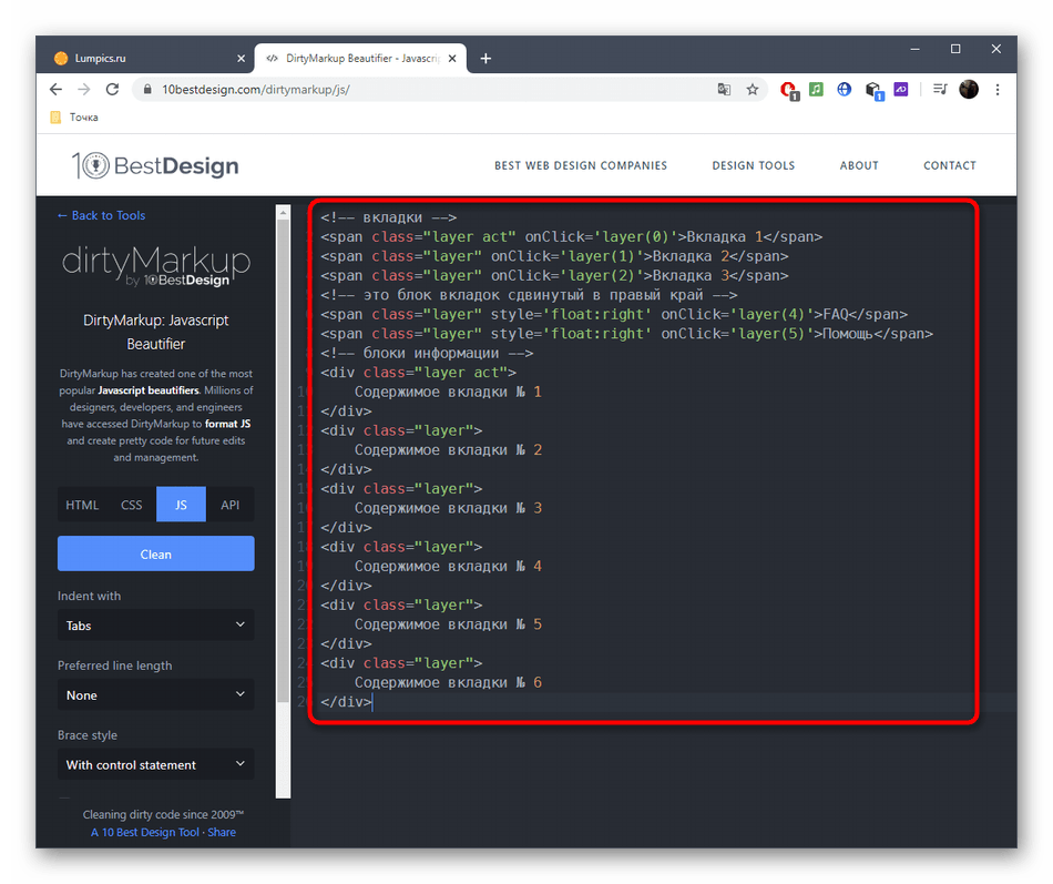- На сайте DirtyMarkup переключитесь в режим «JS», щелкнув по соответствующей кнопке.