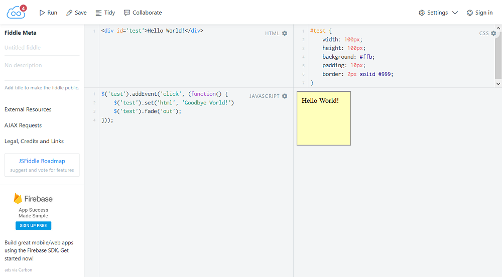 Click inside each panel to initiate the cursor and start writing. Once all your code has been written (in one or two or all panels) hit the “Run” button from the main menu to view the results in the Results panel. You can click on the “Tidy” button to align everything in its right place and choose specific settings that you wish to work with by clicking on the “Settings” button in the top right corner of the screen.