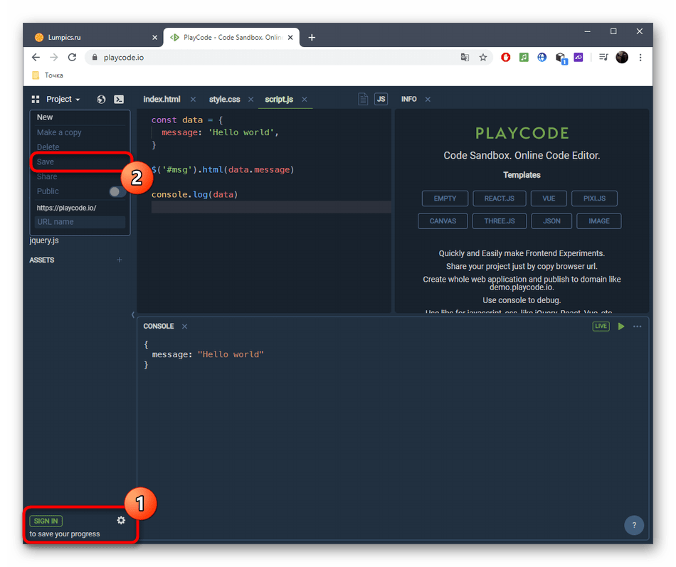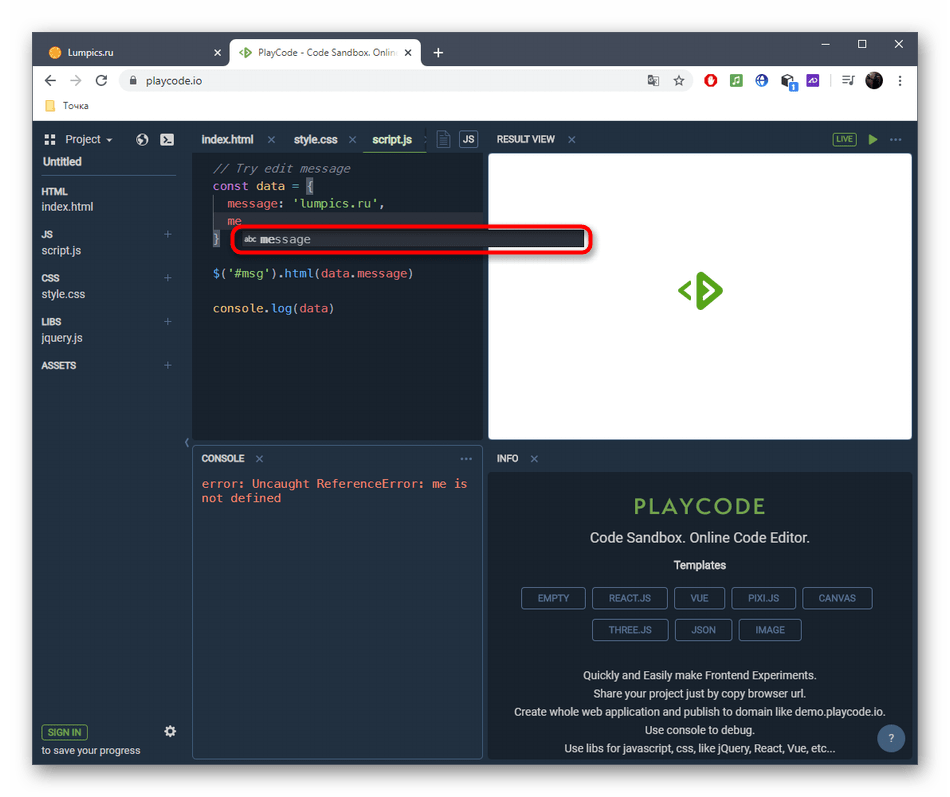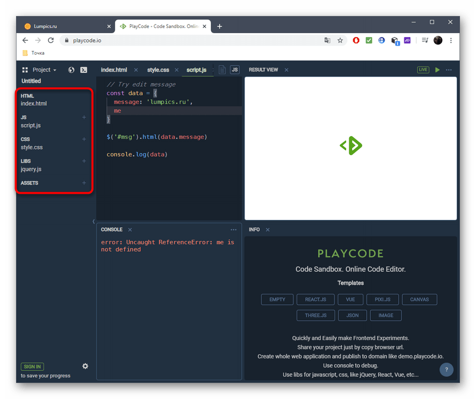 Код из песочницы можно добавлять на Stack Overflow, Хабр и их аналоги. Благодаря этому разработчик может показать свою работу другим пользователям, чтобы попросить помощи или совета. Или наоборот: помочь кому-то, объяснив решение проблемы.