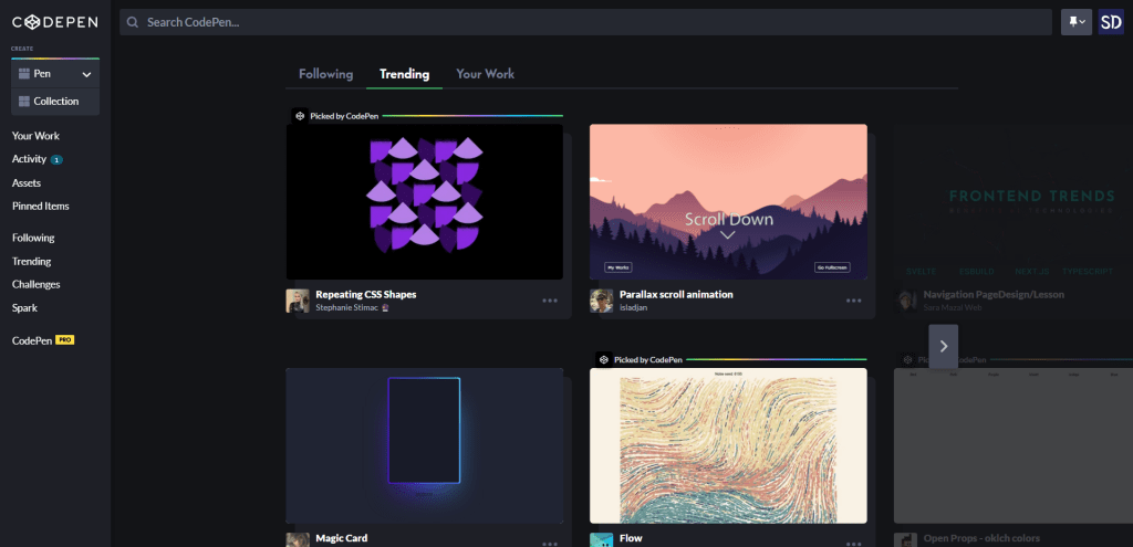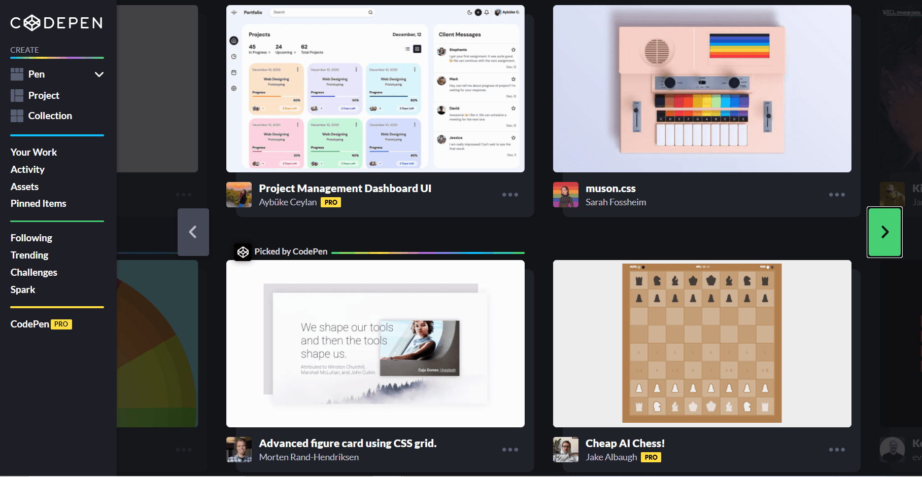 - Improve your skills – CodePen organizes weekly challenges to help you deepen your skills and creativity.