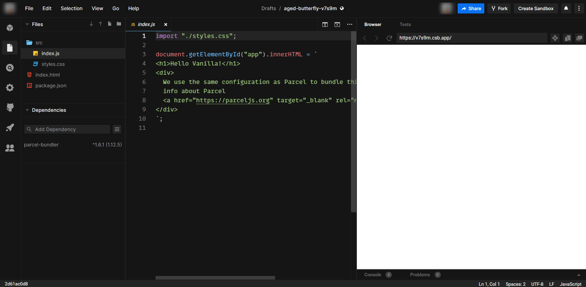 StackBlitz — это песочница на базе Visual Studio. Здесь можно создавать приложения на Angular, Vue, React или использовать другие библиотеки и фреймворки. Плюс этого редактора — простая установка npm-зависимостей и компиляции, можно устанавливать сразу несколько пакетов. А если скопировать кусок кода и вставить в редактор, песочница сама найдёт пропущенные пакеты.