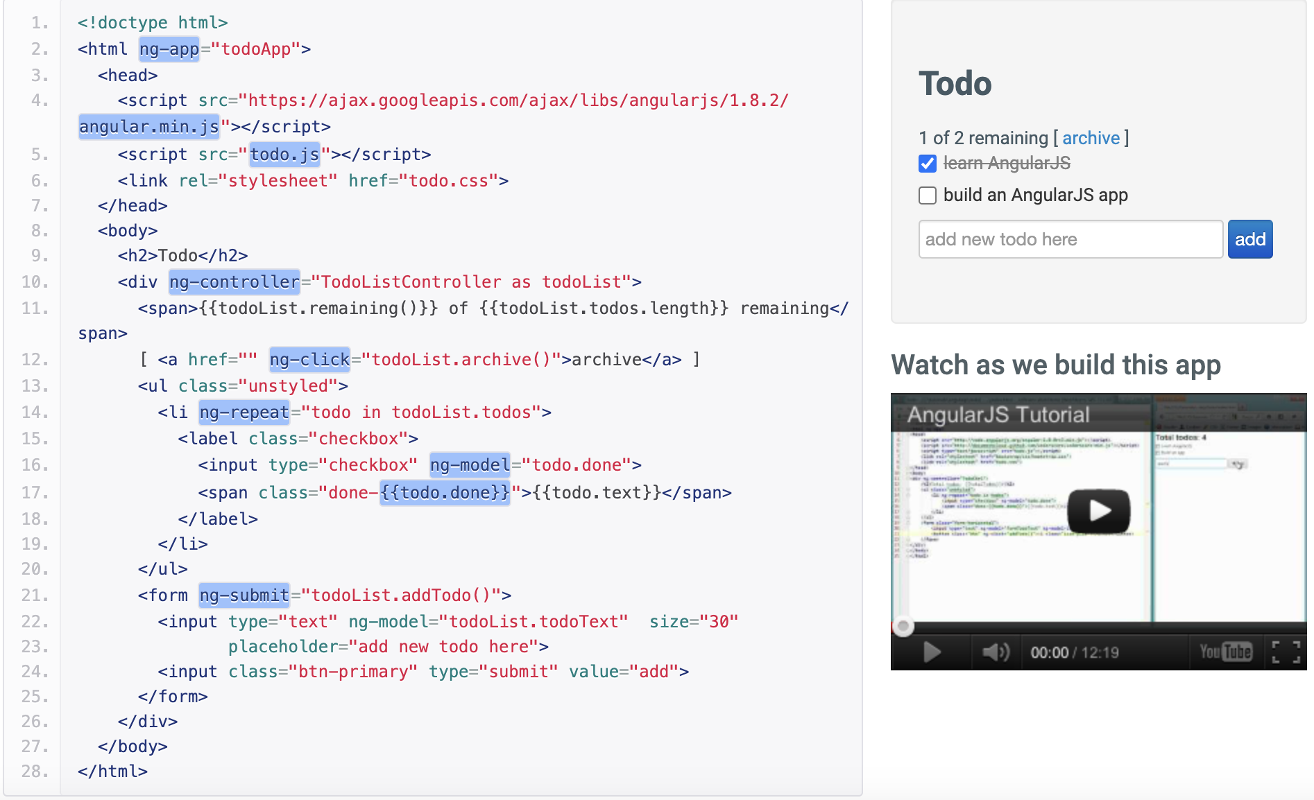 - Удобная связка данных. Автоматически синхронизирует данные между моделью и представлением, что упрощает и ускоряет разработку.