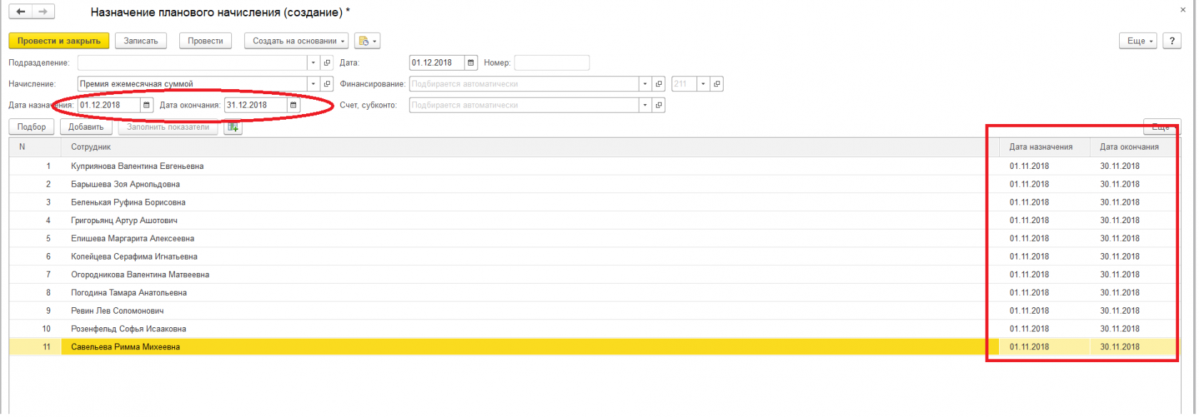 Второй случай, когда вам пригодится этот лайфхак. Например, вам требуется изменить дату или сумму по всем сотрудникам в документе, но вы не хотите перезаполнять его по какой-либо причине. Рассмотрим ситуацию, когда нужно поменять срок планового начисления для группы сотрудников, не прибегая к перезаполнению документа (рис.16).