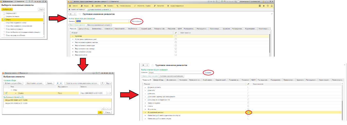 При выборе элемента нужно добавить условия, согласно которым добавляется отбор по «Ссылке» (рис.15), которая указывает на определенный документ. В нашем случае это исходный «Отпуск», который нельзя редактировать. После выбора нужного документа закройте форму и обязательно проверьте в форме выбора, что у вас стоит «1 элемент», а не «Все элементы» (рис.15). Если все в порядке, то перейдите к поиску показателя с названием «Исправленный документ» и напротив него поставьте галку (рис.15). Стоит отметить, что перед тем, как нажать кнопку «Изменить реквизиты», обязательно следует закрыть все окна с этими отпусками и снять с проведения документ-исправление, и только тогда нажать команду выполнения операции.