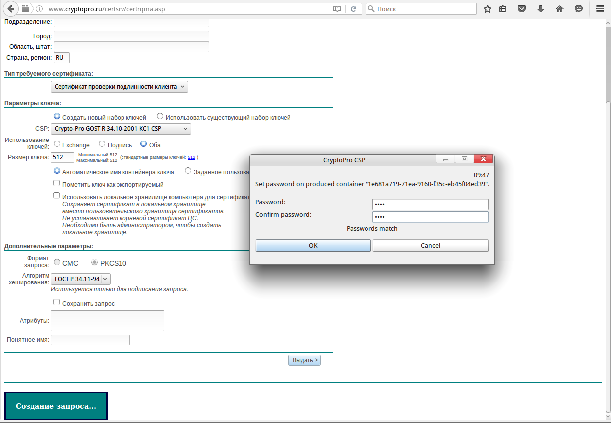 На этом этапе может потребоваться пин-код для контейнера. Обычно по умолчанию используются следующие варианты: