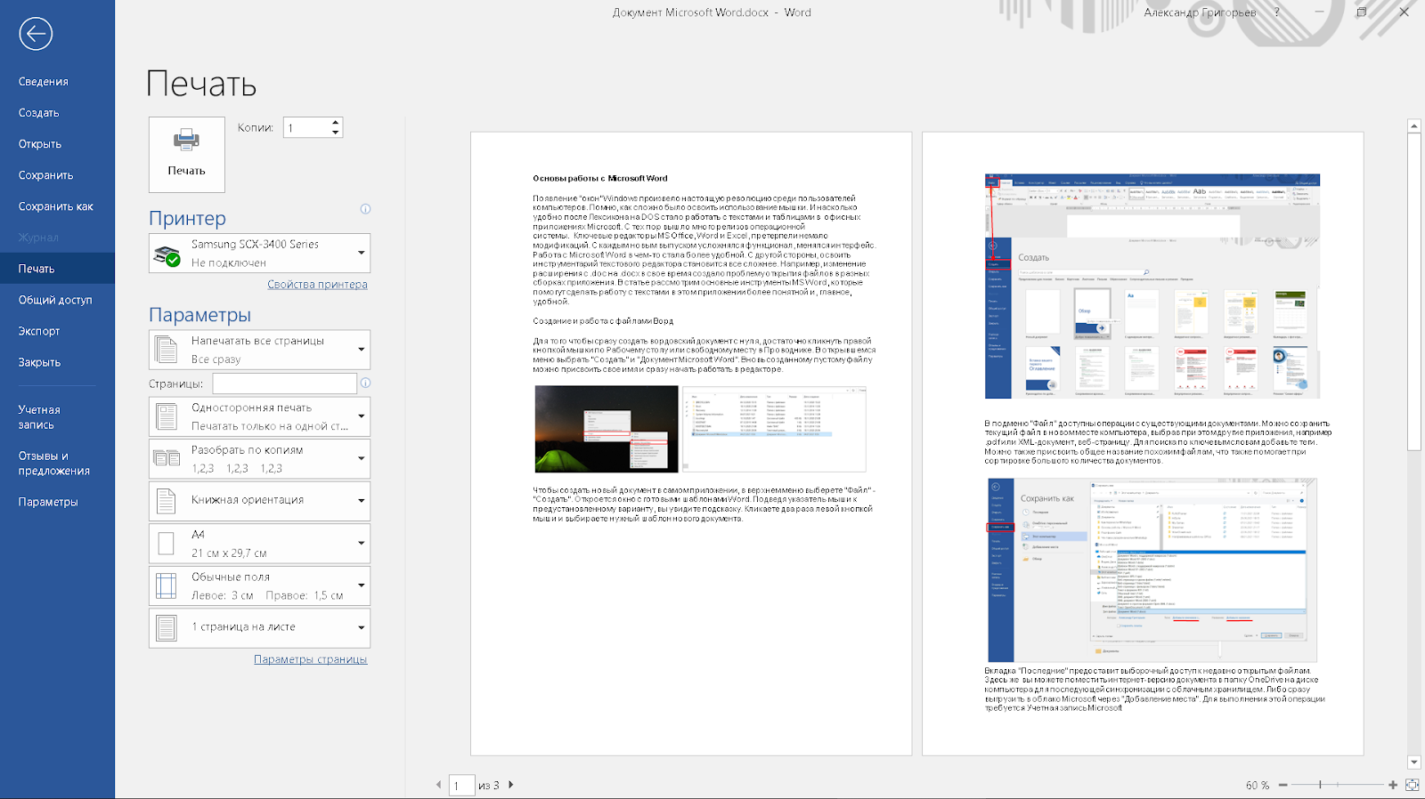 Активировав вкладку “Печать”, вы получите доступ к настройкам печати документа. Данное меню можно быстро вызвать из самого документа при помощи “горячих клавиш” Ctrl+P.
