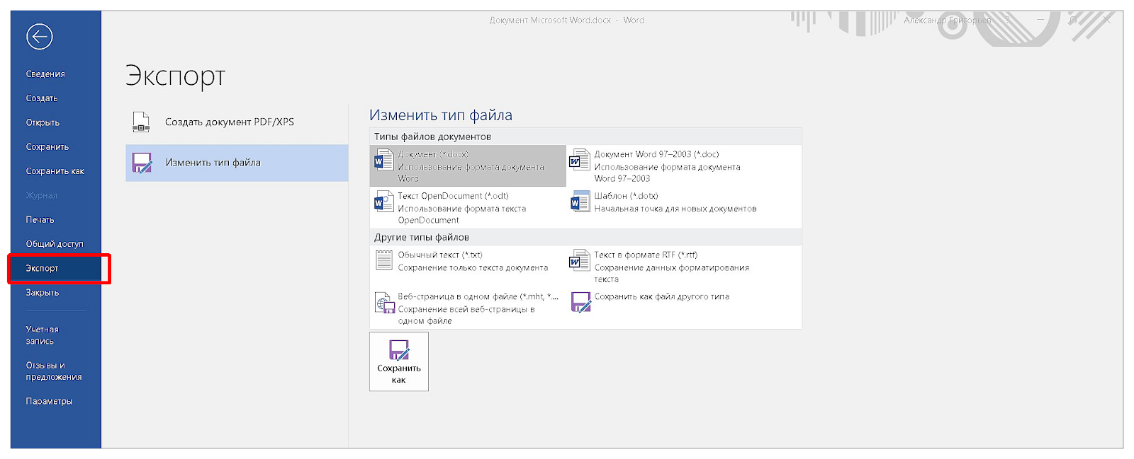 Инструмент “Экспорт” дает возможность преобразовать файл в документ PDF/XPS, изменить тип файла на альтернативный. Данная операция в чем-то аналогична функционалу “Сохранить как” с выбором расширений, но производит более корректную конвертацию из одного приложения в другое.