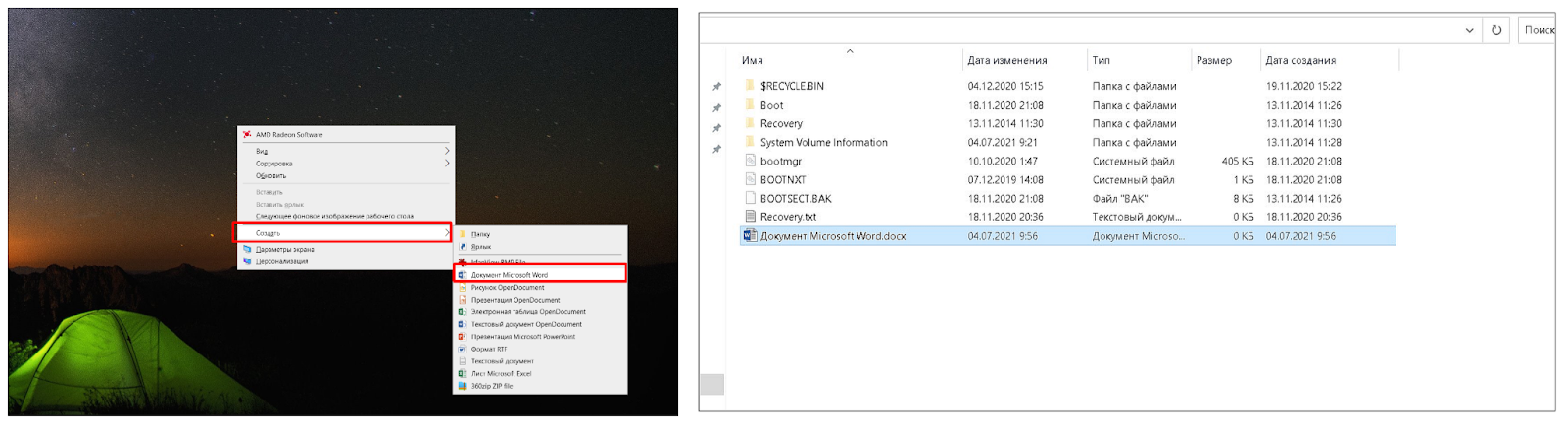 Для того чтобы сразу создать вордовский документ с нуля, достаточно кликнуть правой кнопкой мышки по Рабочему столу или свободному месту в Проводнике. В открывшемся меню выбрать “Создать” и “Документ Microsoft Word”. Вновь созданному пустому файлу можно присвоить свое имя и сразу начать работать в редакторе.
