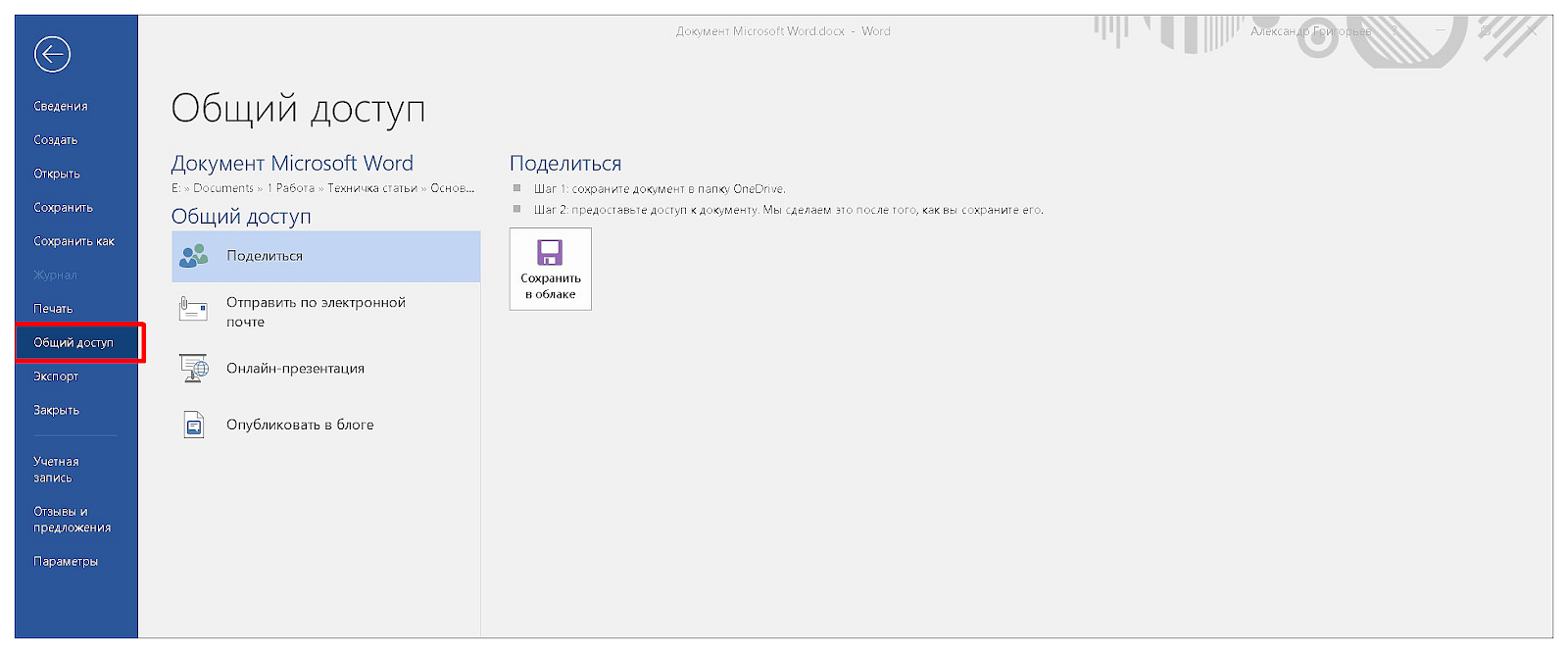 Если необходимо настроить общий доступ к документу в облаке, отправить по электронной почте, опубликовать в блоге либо преобразовать в онлайн-презентацию, воспользуйтесь функционалом “Общий доступ”.