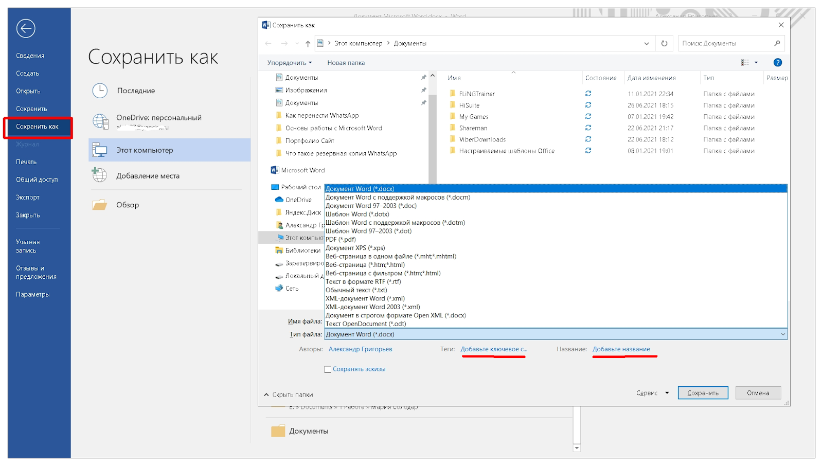 В подменю “Файл” доступны операции с существующими документами. Можно сохранить текущий файл в новом месте компьютера, выбрав при этом другие приложения, например .pdf или XML-документ, веб-страницу. Для поиска по ключевым словам добавьте теги. Можно также присвоить общее название похожим файлам, что также помогает при сортировке большого количества документов.