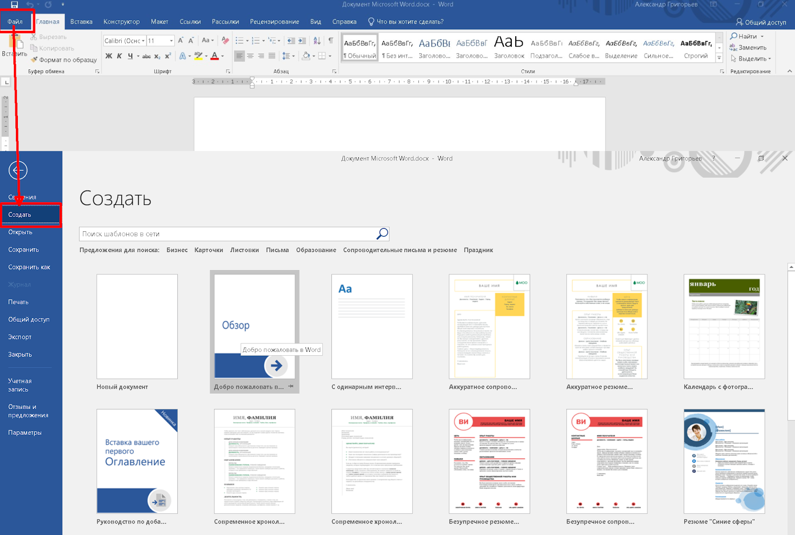Чтобы сформировать новый документ в самом приложении, в верхнем меню выберете “Файл” — “Создать”. Откроется окно с готовыми шаблонами Word. Подведя указатель мыши к предустановленному варианту, вы увидите подсказку. Кликаете два раза левой кнопкой мыши (ЛКМ) и выберите нужный шаблон нового документа.