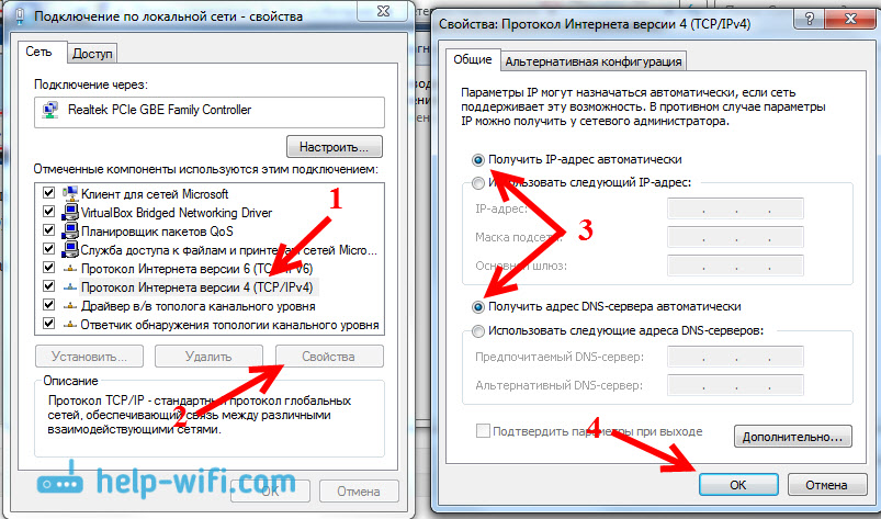 Дальше, выделяем «Протокол интернета версии 4…», нажимаем на кнопку «Свойства», и если в новом окне у вас заданы какие-то адреса, то ставим автоматическое получение IP и DNS, и нажимаем Ok.